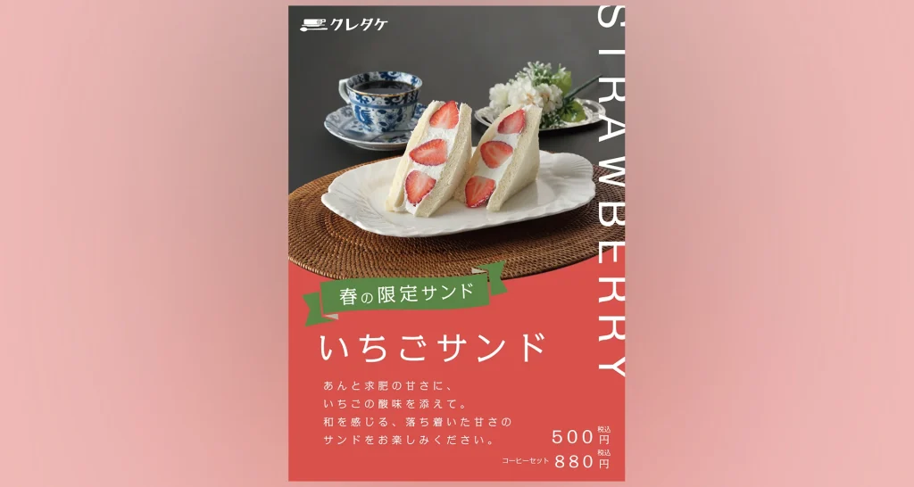 和と洋が重なる、クレタケさまならではのいちごサンド 喫茶クレタケさまの人気メニューのひとつが、求肥・白あん・クリームを使った、特製いちごサンドです。 やさしい甘さの白あんと求肥。なめらかなクリーム。そこに、ほどよい酸味の … 続きを読む ちょっぴり和風な喫茶店で楽しむ、いちごサンドのポスター
